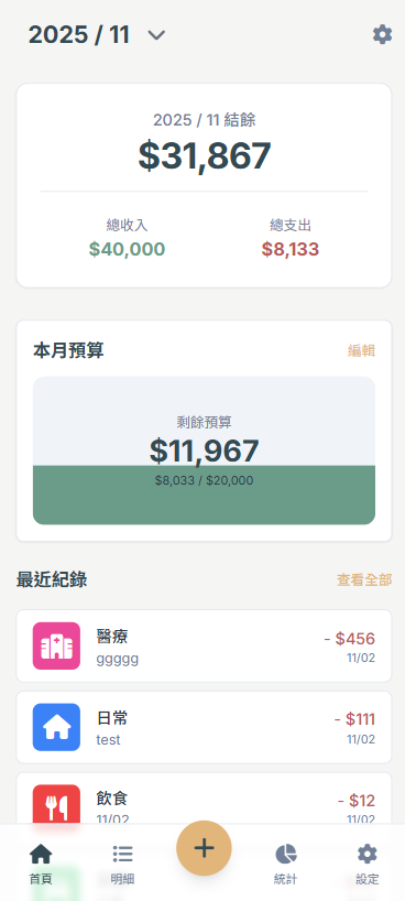 - 智能導覽: 底部導覽優化為首頁、記帳、明細三大功能,統計功能整合至首頁便於快速訪問。