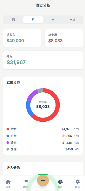- 視覺化增強: 支出分類甜甜圈圖中央顯示總額,提供直觀的支出概覽。